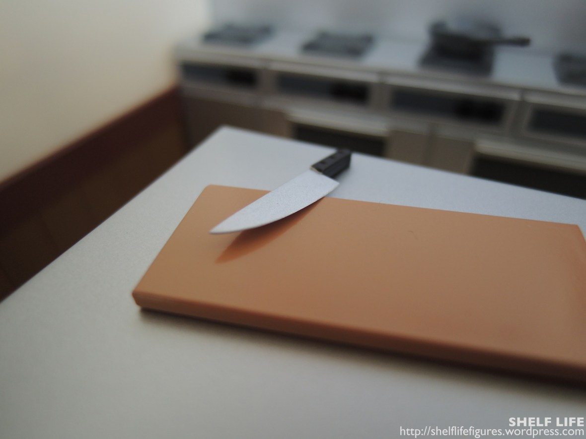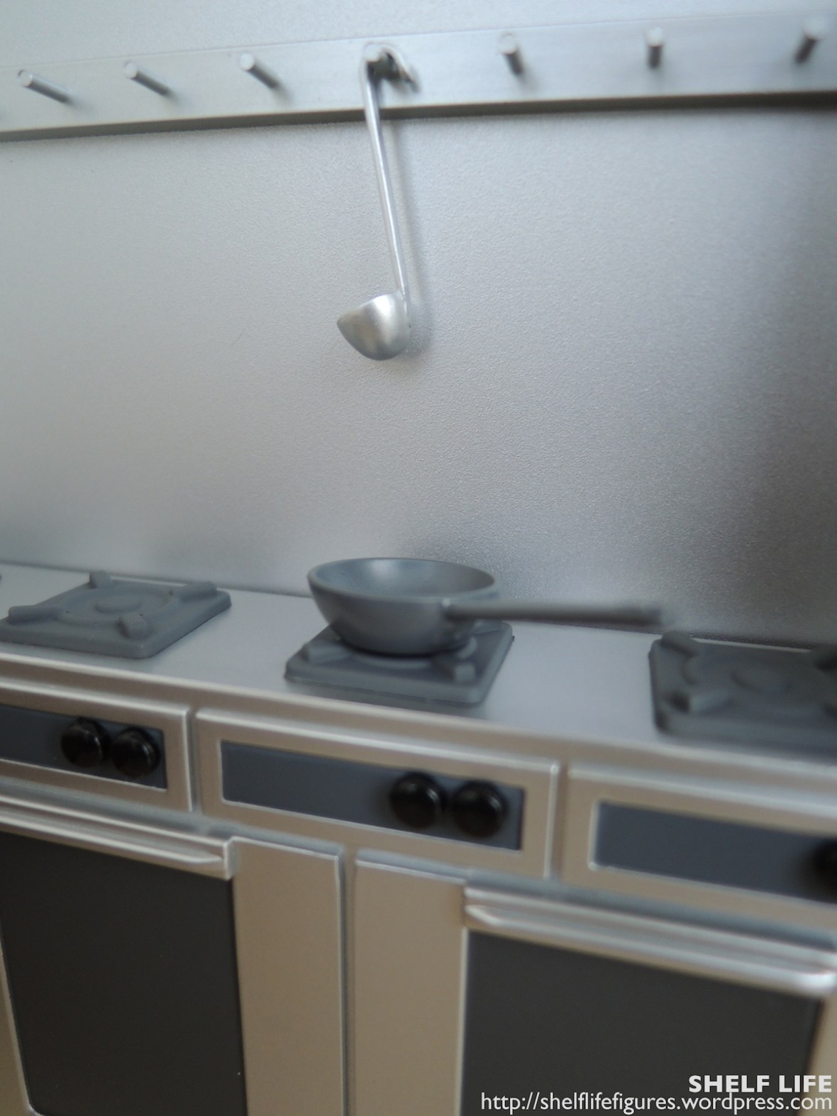Other accessories include a knife and cutting board, a cooking pan, and a ladle. I like how you can hang both the ladle and the pan on the rack above the range.