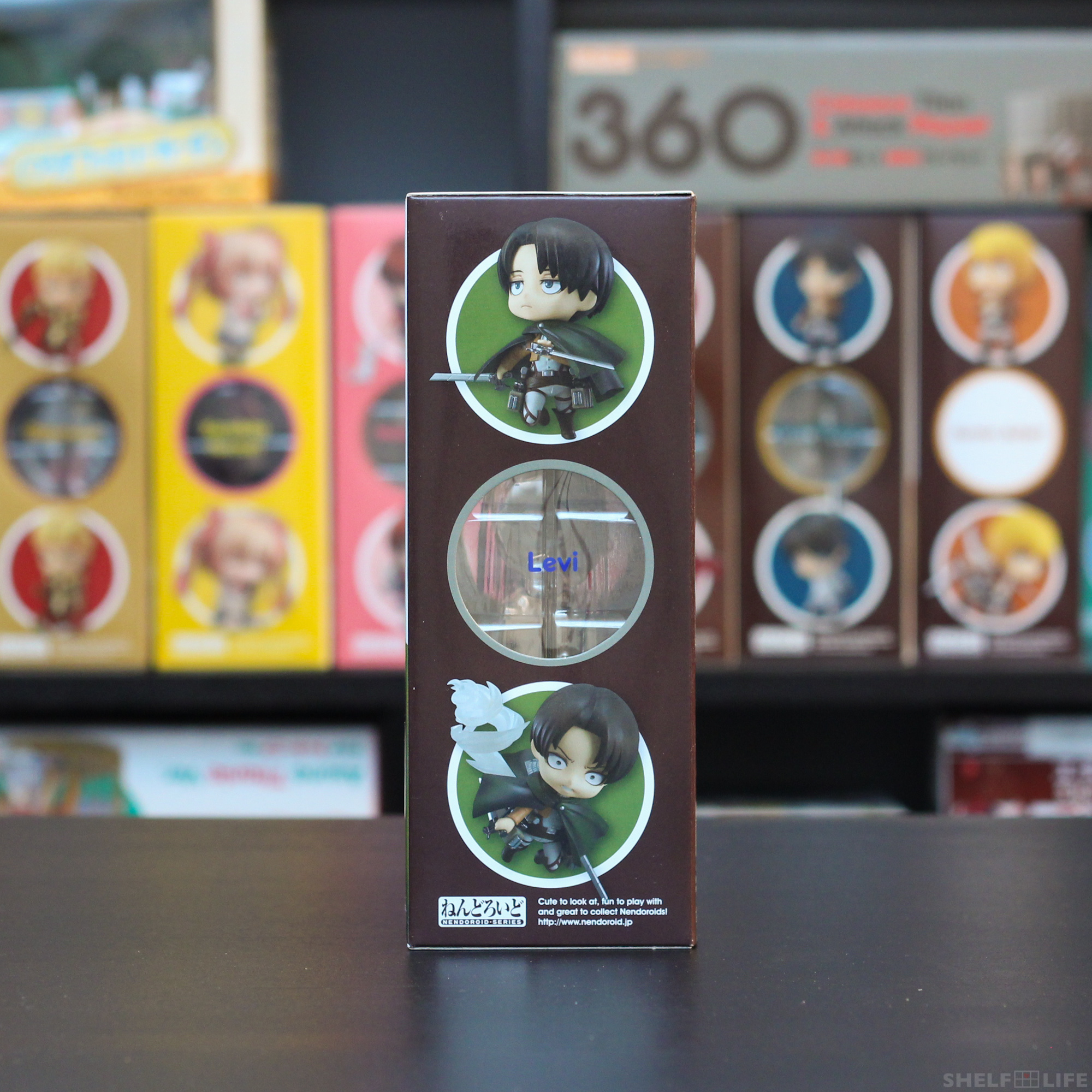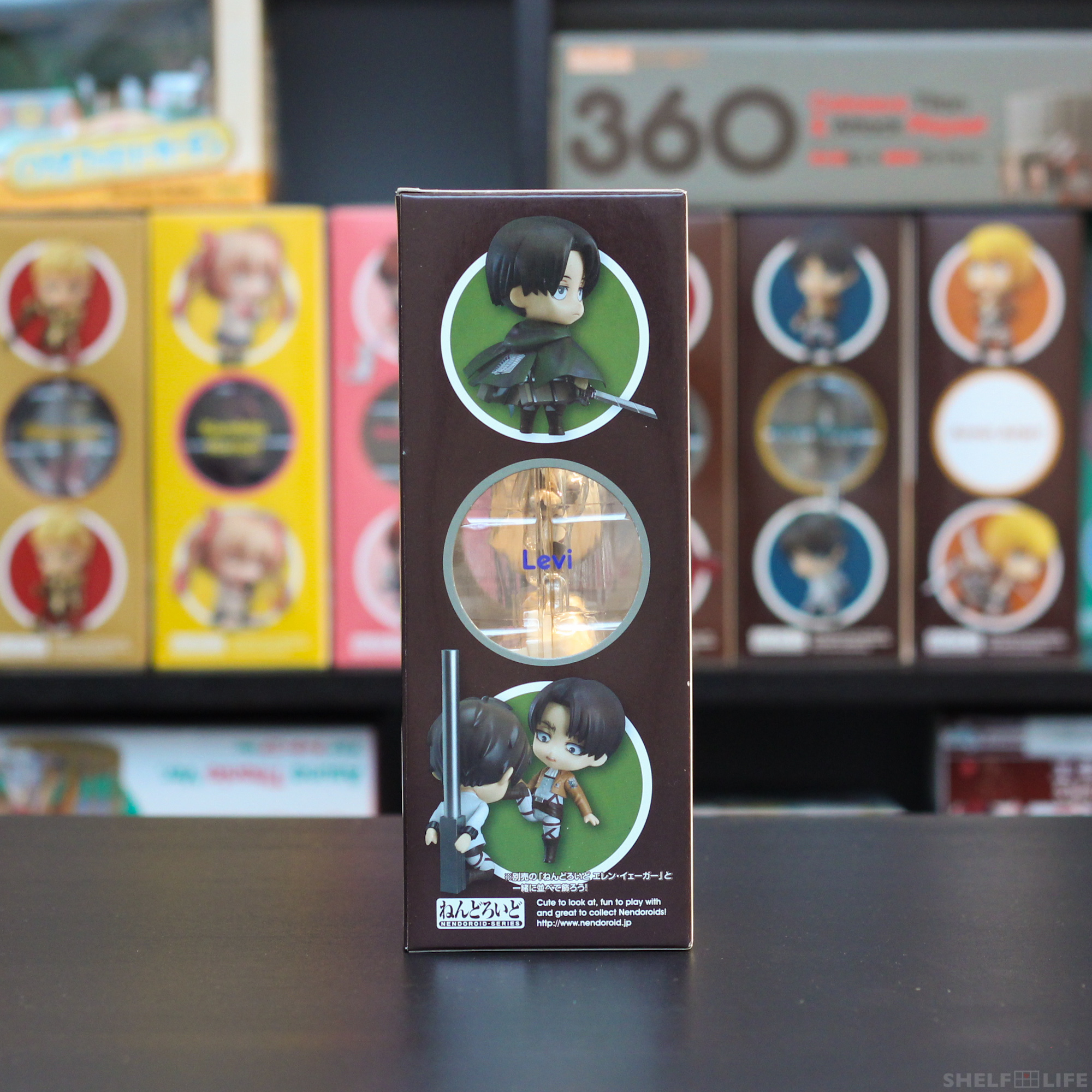 Levi comes in a standard-sized box in the typical post-300 design. All Shingeki no Kyojin Nendoroid boxes (except the Colossal Titan Playset) come in the colour brown, although Mikasa‘s box came in a slightly lighter shade.
