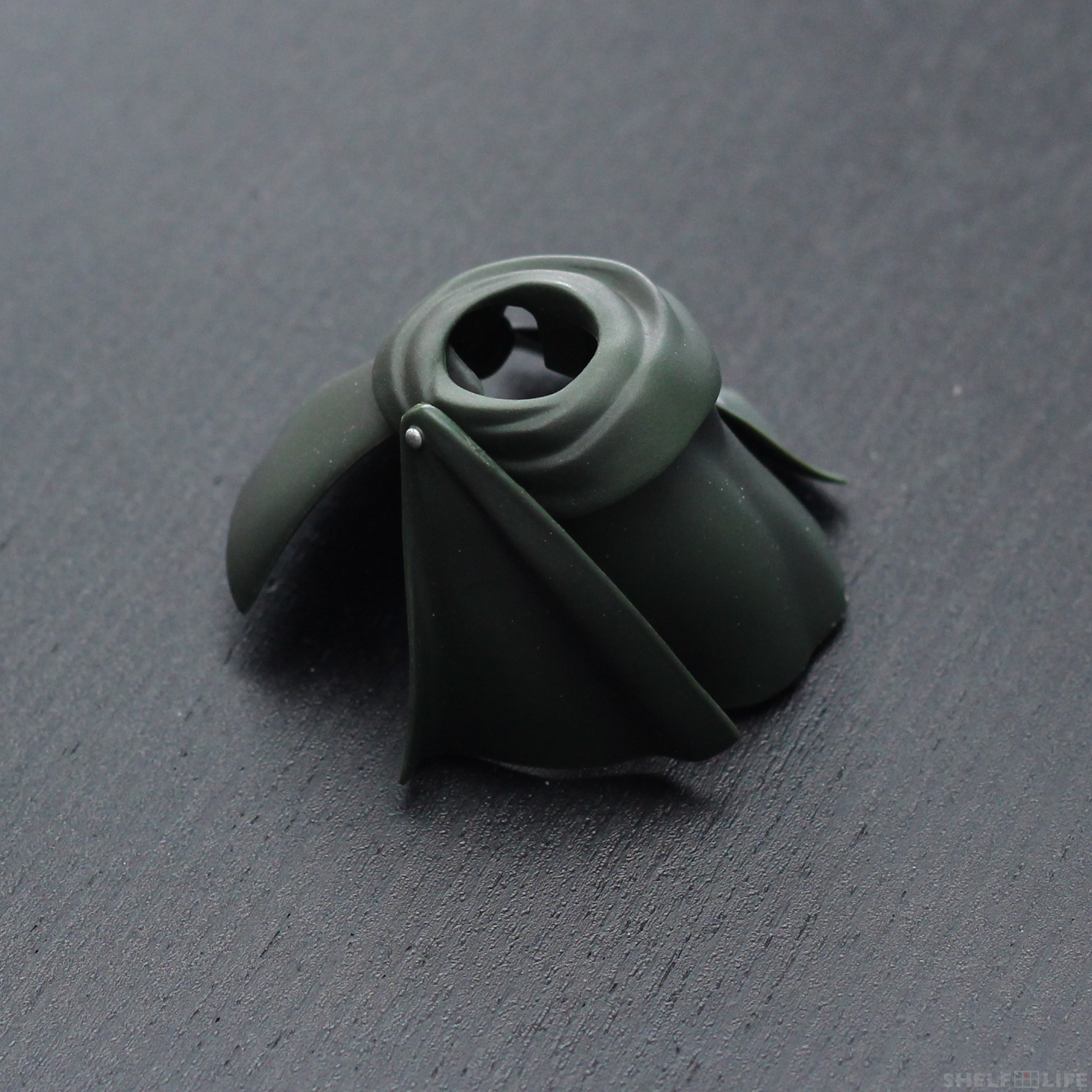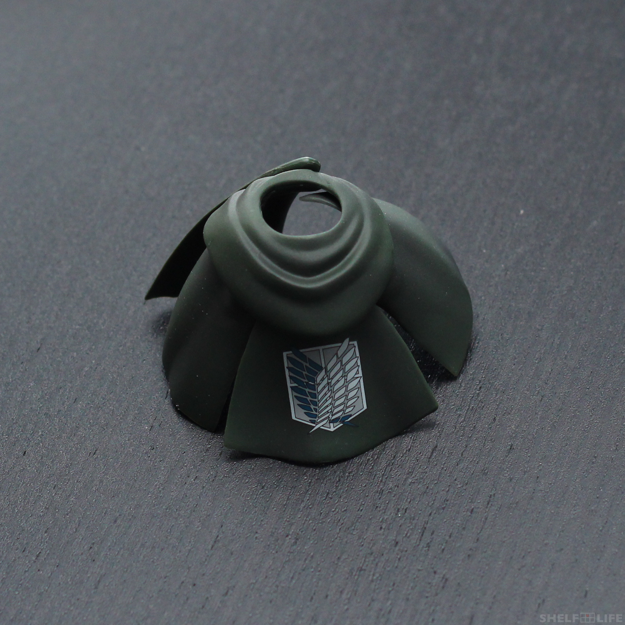 The cloak is made out of plastic, and the hood that goes around Levi’s neck is connected to four main pieces. The front of the cloak is attached by a peg, and the other three sides are all attached by a different ball joint.